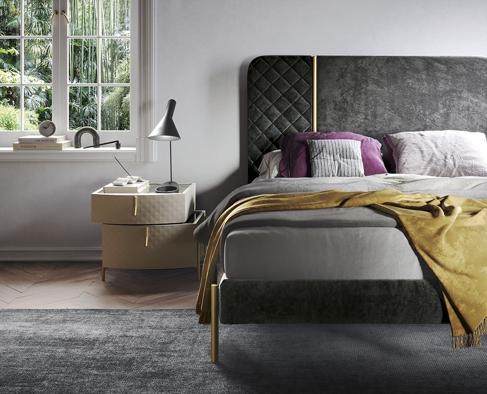 Gepolstertes Bett aus glattem und gestepptem Stoff
