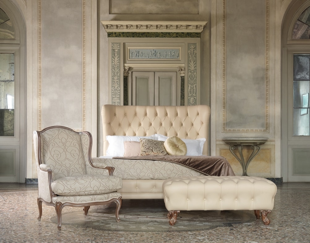 Gepolstertes Doppelbett, gepolstert in Stoff oder Leder mit Capitonné-Verarbeitung. Ideales Bett für die Einrichtung klassischer Schlafzimmer. Anpassbares und maßgeschneidertes Produkt verfügbar.