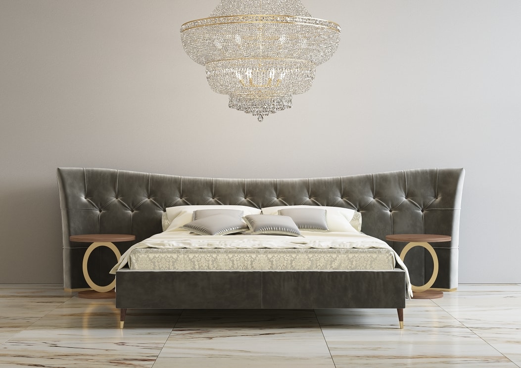 Doppelbett mit handgefertigtem Kopfteil, erhältlich in Stoff und Leder, personalisierte Größen sind verfügbar. Bett Ring kann Füße wie auf dem Bild haben, oder kann direkt auf den Boden gehen.