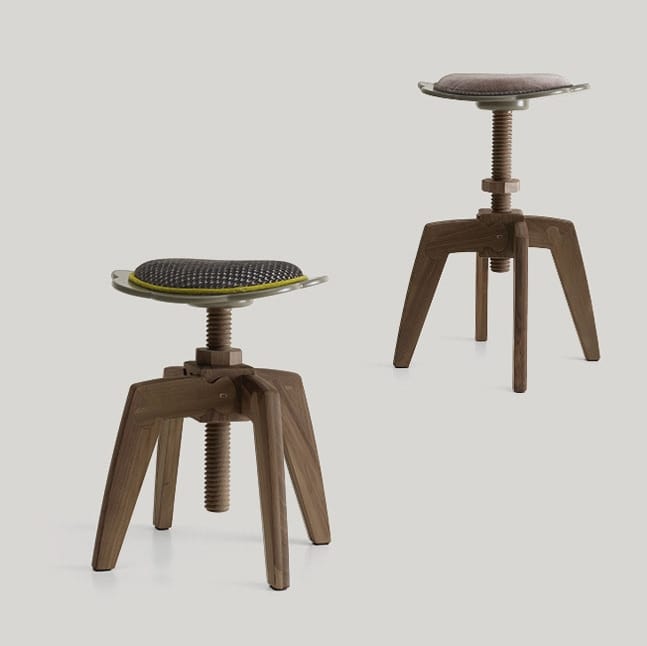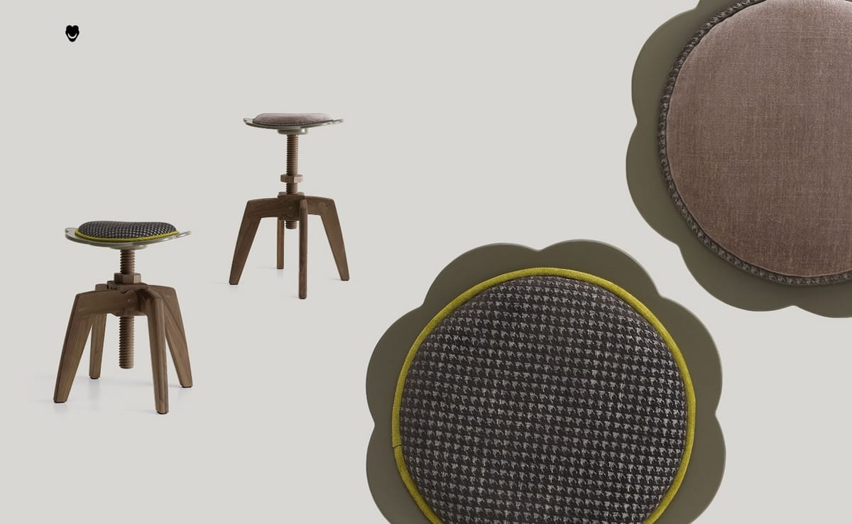 Hocker mit blumenförmigem Sitz, mit rundem Kissen. In der Höhe konkurrenzlos mit Schraubmechanismus. Holzstruktur.
