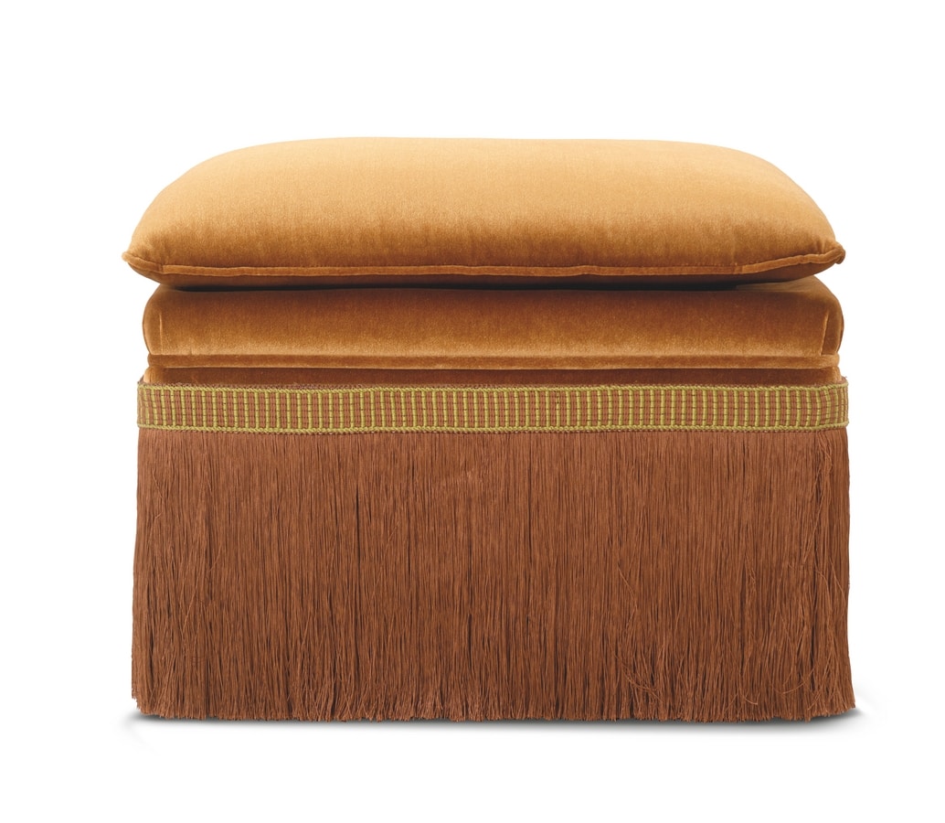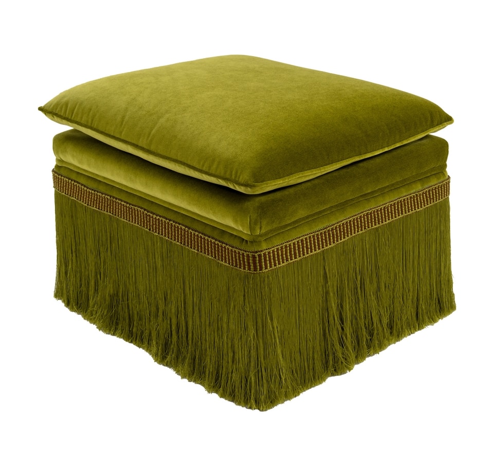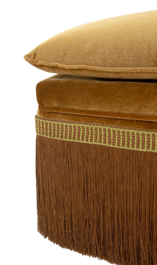 Polsterer Samt Pouf mit einem passenden Top -Kissen. Die Basis ist mit einem langen dekorativen Rand geschmückt.