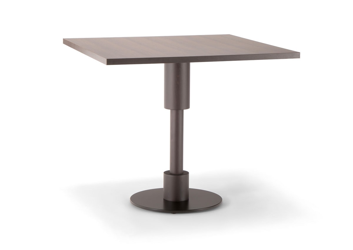 Massivholztische, gekennzeichnet durch raffinierte und elegante Linien. Perfekt für die Einrichtung von Designumgebungen. Der Tisch besteht aus hochwertigen Materialien, die seine Stabilität in den Vertragsumgebungen gewährleisten. Die Tischplatte besteht entweder aus Buchenfurnierholz oder Laminat. Die Tischplatte besteht aus massivem Holz mit einer Gussplatte, die an der Basis entweder mit Satin oder Chromstahl bedeckt ist.