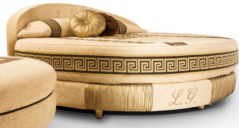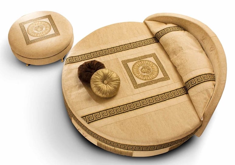 Rundes Bett mit 210 cm Durchmesser. Möglichkeit, Ihre Initialen zu sticken. Matched Puff mit 85 cm Durchmesser. In verschiedenen Ausführungen erhältlich.