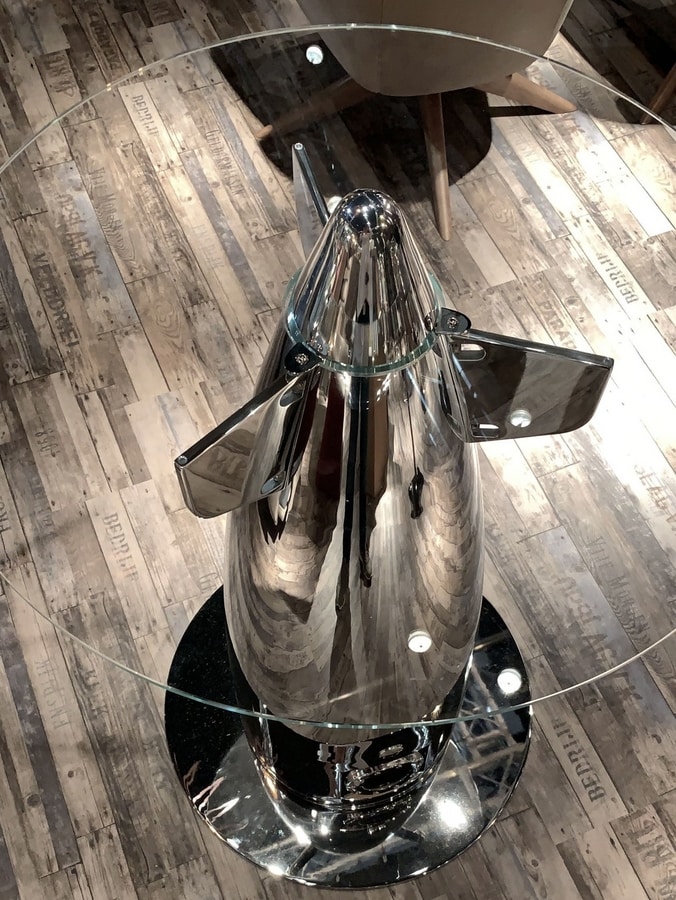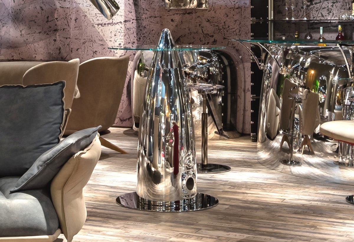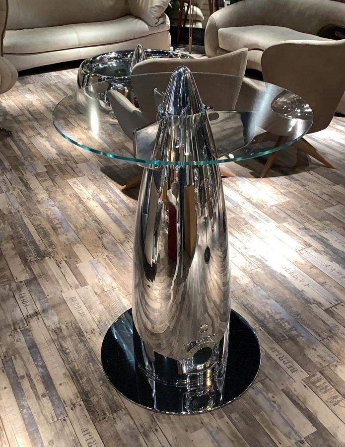 Dieser einzigartige Bartisch wurde aus dem vorderen Abschnitt eines originalen Alpha Jet-Treibstofftanks aus dem Jahr 1973 gefertigt. Ein echtes Stück Luftfahrtgeschichte, das in ein funktionales und stilvolles Möbelstück verwandelt wurde und jedem Raum eine aeronautische Note verleiht.
