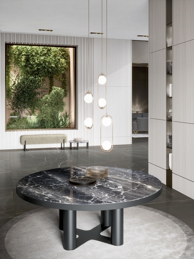 Erhältlich in 20 mm dickem echtem Marmor mit Intarsien, möglich mit Kombinationen der verschiedenen Marmore: Zebrino, Volakas, Valentine Grey, Amani Grey, Antigua Green und Cipollino. Oder aus hochdichter Spanplatte, furniert in Eukalyptusholz mit offenporig matt lackierter Einlage oder furniert in Ebenholz oder Eiche, auch mit gebürsteter, glänzender 100-Glanz-Lackeinlage.