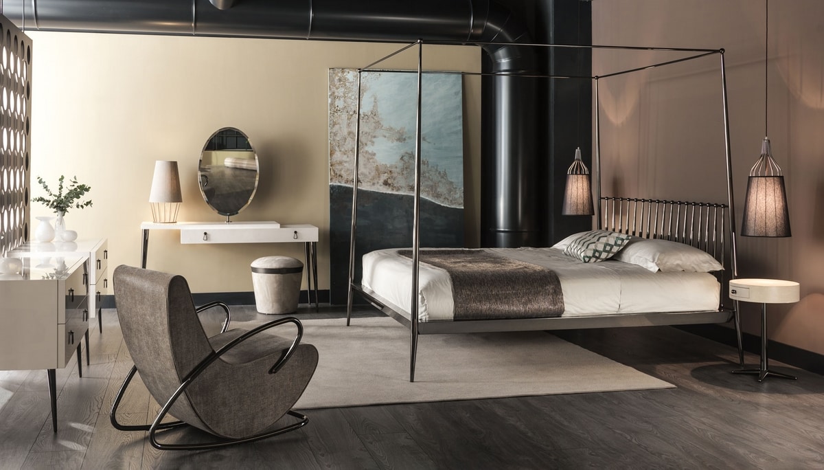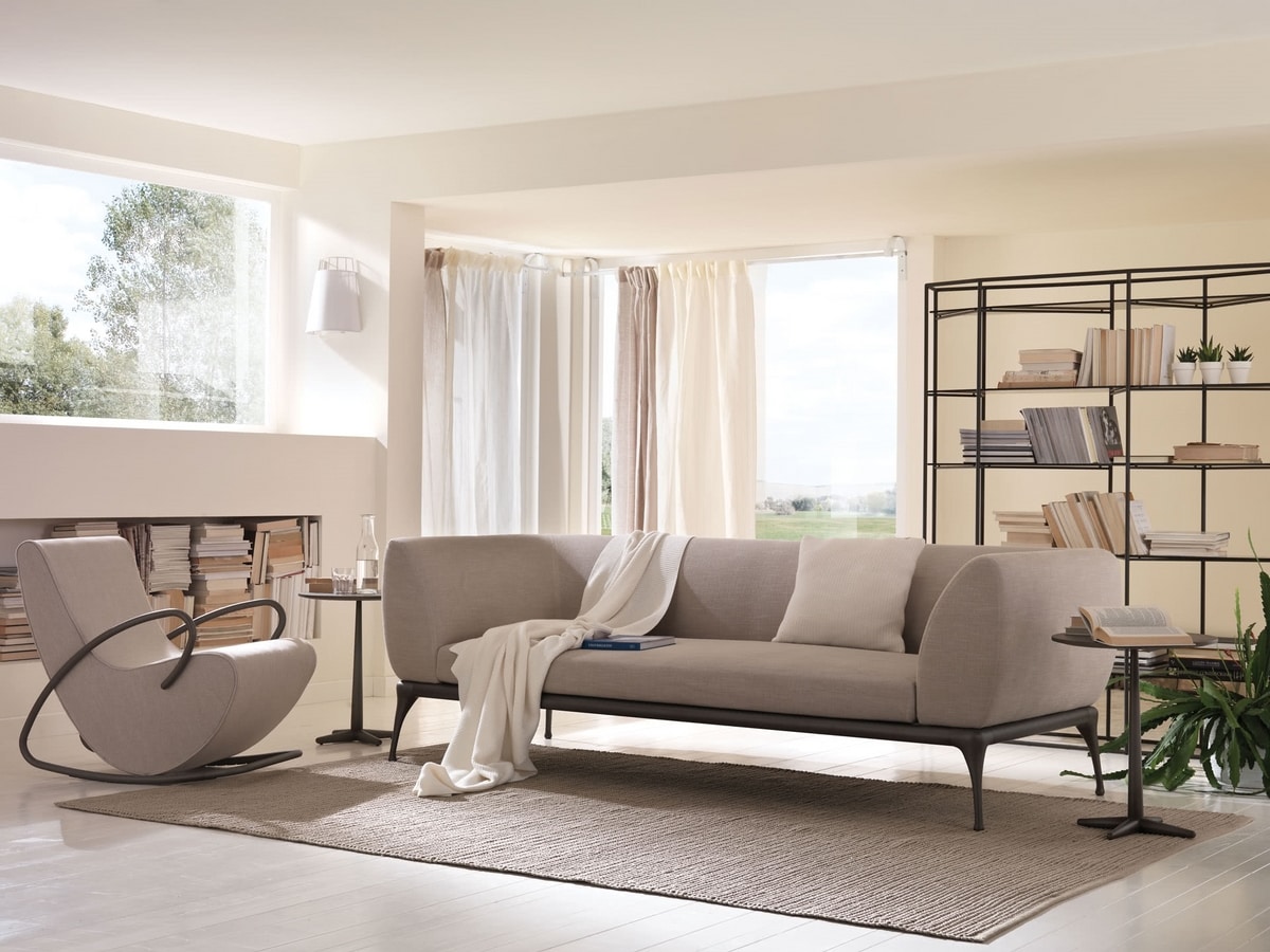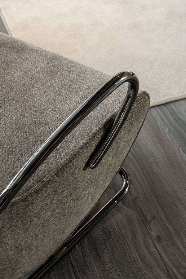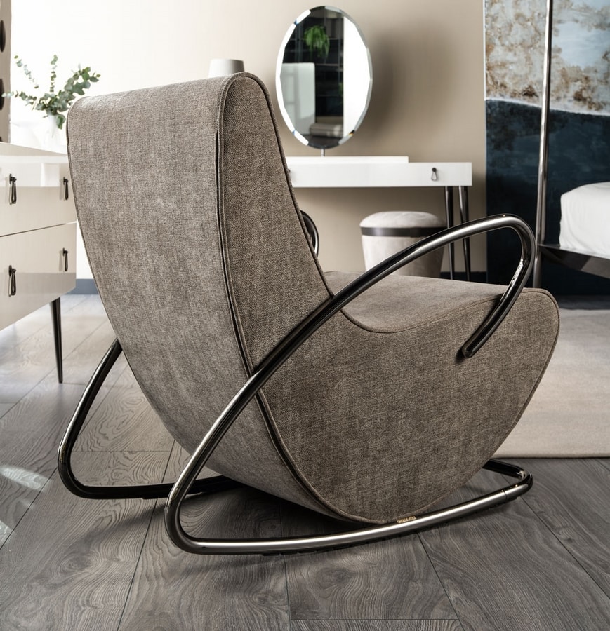 Eine Metallstruktur umhüllt den gepolsterten Teil und bildet sowohl die Armlehnen als auch die Kufen des Schaukelstuhls. Der Innenraum des Sitzes besteht aus profiliertem Holz, ist mit Gummi zweier Dichte gepolstert und mit Stoff, Samt, Leder oder einem beliebigen maßgefertigten Stoff bezogen.