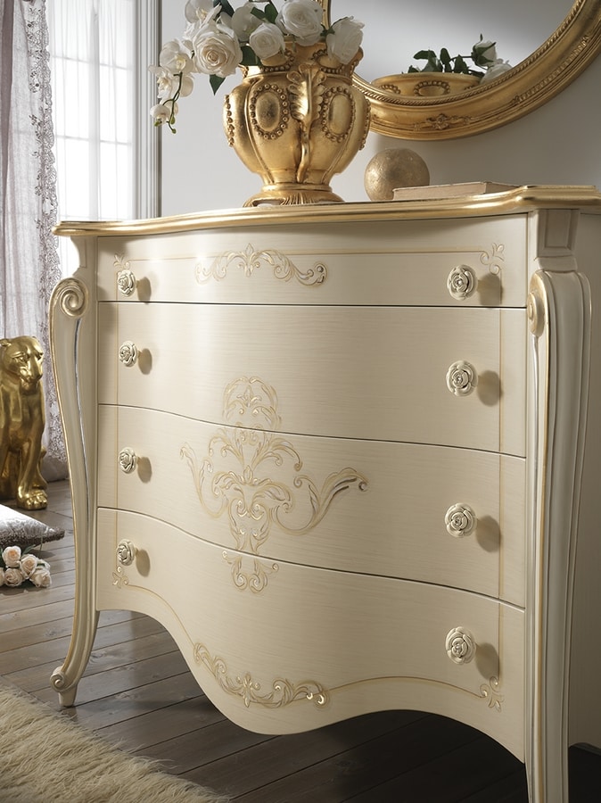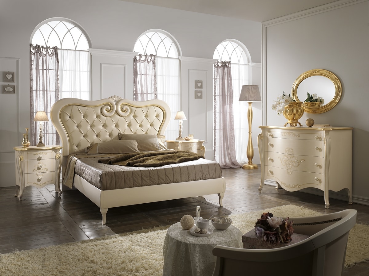 Chanel-Schlafzimmer Von Hand patiniert, bestehend aus: 3 Schwebetürenschrank mit Innenausstattung inklusive: nr. 3 Regale Saft. 36 mm, Nr. 5 Kleiderbügelrohre und nr. 1 Kommode mit 3 Schubladen. Kommode plus zwei Nachttische. Bett mit patiniertem Kopfteil mit Blattgoldprofil und beiger Öko-Lederpolsterung mit Swarovski-Einsätzen. Niedriger Bettrahmen aus patiniertem Holz. Spiegel enthalten.