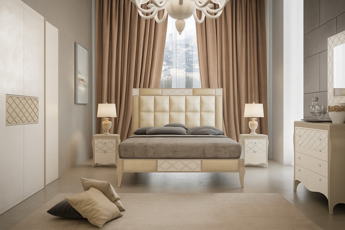 Preise anfordern Ähnliche ProdukteEin komplettes Schlafzimmerset im modernen Stil mit Kleiderschrank, Bett, Kommode und Nachttischen – elegant und funktional gestaltet. Die Oberflächen sind mit wasserbasierten Lacken und Finishes versehen und durch Designdetails wie Rauchspiegel und raffinierte geometrische Prägungen aufgewertet. Erhältlich in verschiedenen Varianten für unterschiedliche Innenräume. Der Kleiderschrank ist mit Soft-Close-Schiebe- und Führungssystemen für Langlebigkeit und Komfort ausgestattet, während Kommode und Nachttische großzügigen Stauraum mit einem Hauch moderner Eleganz bieten. Das Bett besticht durch klare Linien und kann mit verschiedenen Bezugsstoffen und Oberflächen individuell gestaltet werden. Dank der großen Auswahl an anpassbaren Farben, Oberflächen und Dekorationen ist dieses Schlafzimmerset die ideale Wahl für alle, die ein modernes, stilvolles und einzigartiges Ambiente suchen. Technische Merkmale