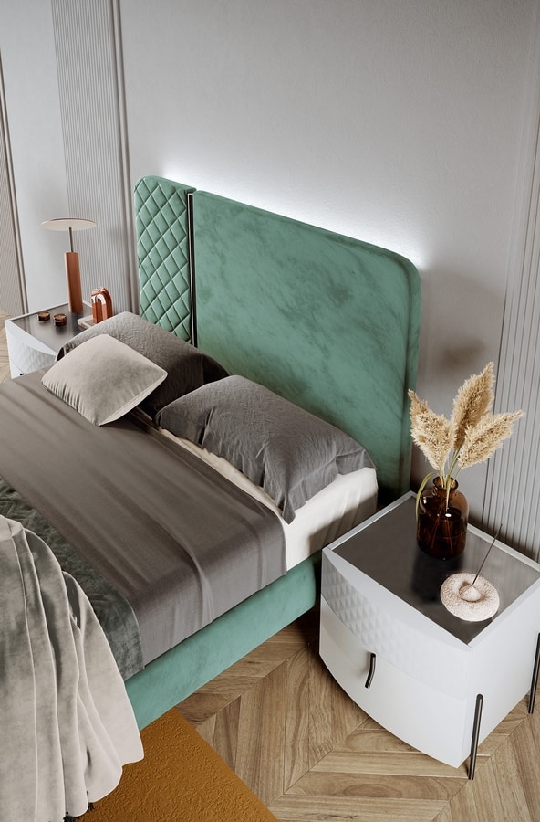Modernes, mattweiß lackiertes Schlafzimmer mit goldenen Details, bestehend aus einem zweitürigen Schiebeschrank, einem Triptychon aus Kommoden und Nachttischen, einem Bett des Modells Plus mit großem Kopfteil, bezogen mit hellem Nabucco-Stoff.