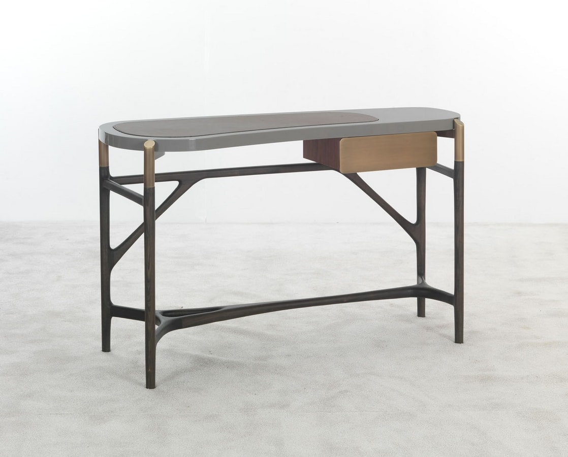 Schminktisch mit Struktur aus massivem Eschenholz, grau gebeizt, mit oberen Elementen und Schubladenfront aus hellbronziertem, mattem Messing. Lackierte Oberseite mit Ledereinsatz.