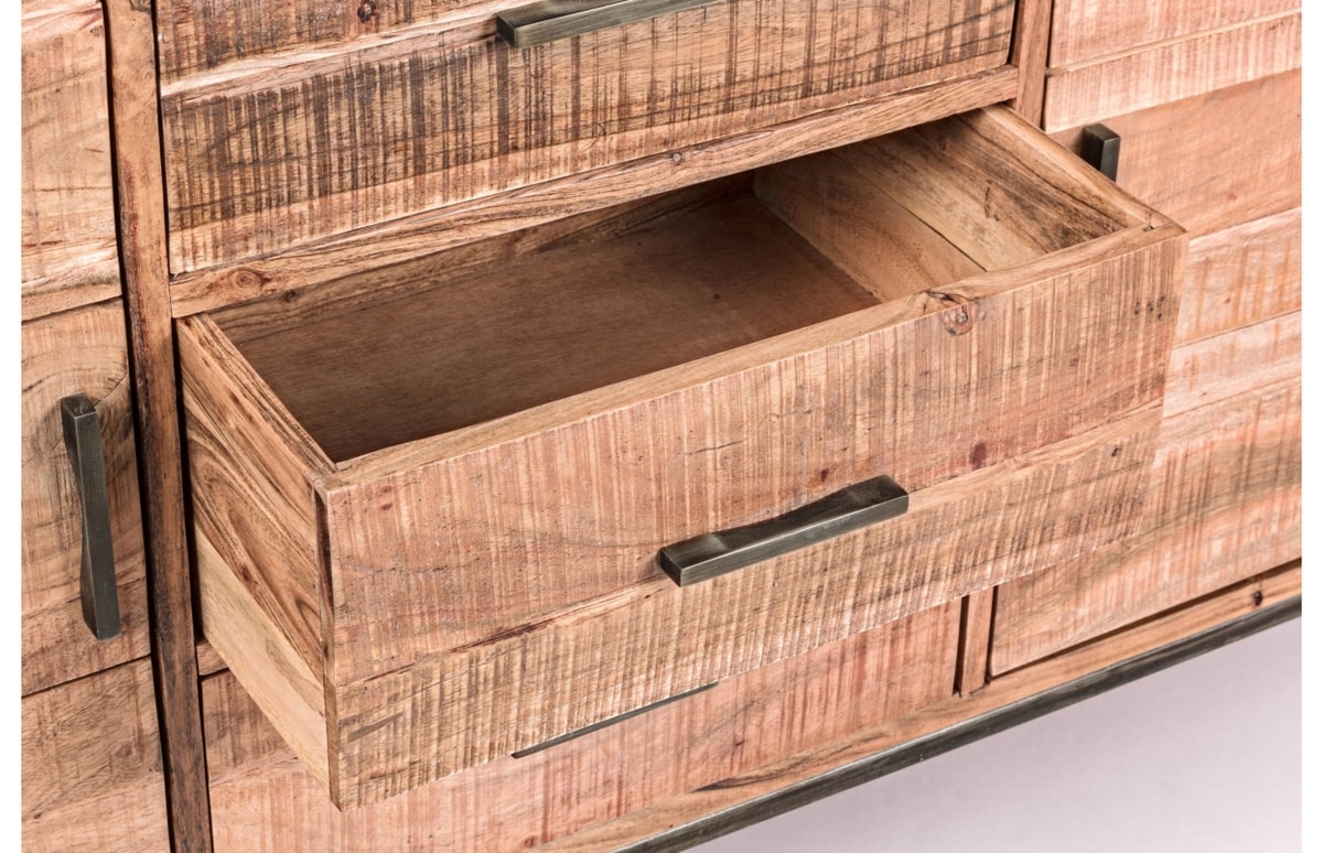 Sideboard mit zwei Türen und drei Schubladen. Struktur aus Akazienholz und Eisen, Rückseite aus Sperrholz. Acryl-Schutzlackierung.