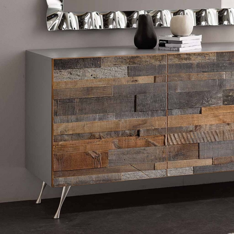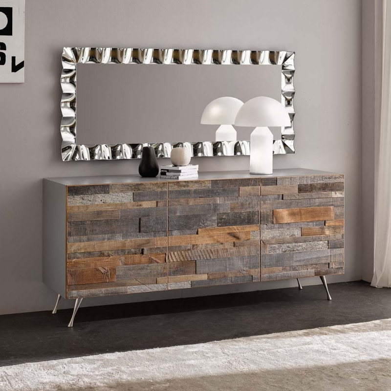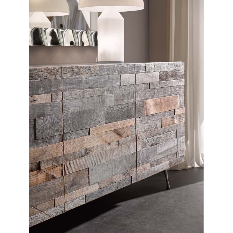 Preise anfordern Ähnliche ProdukteModernes Sideboard mit 3 Türen aus einem Mosaik aus alten Hölzern. Der Bau der Türen wird erfahrenen Tischlern anvertraut, die verschiedenfarbige Hölzer mischen, um jedes Mal einen Vintage- und natürlichen Effekt zu erzielen. Im Inneren befinden sich 3 Fächer mit 3 höhenverstellbaren Einlegeböden. Beine aus verchromtem Metall.