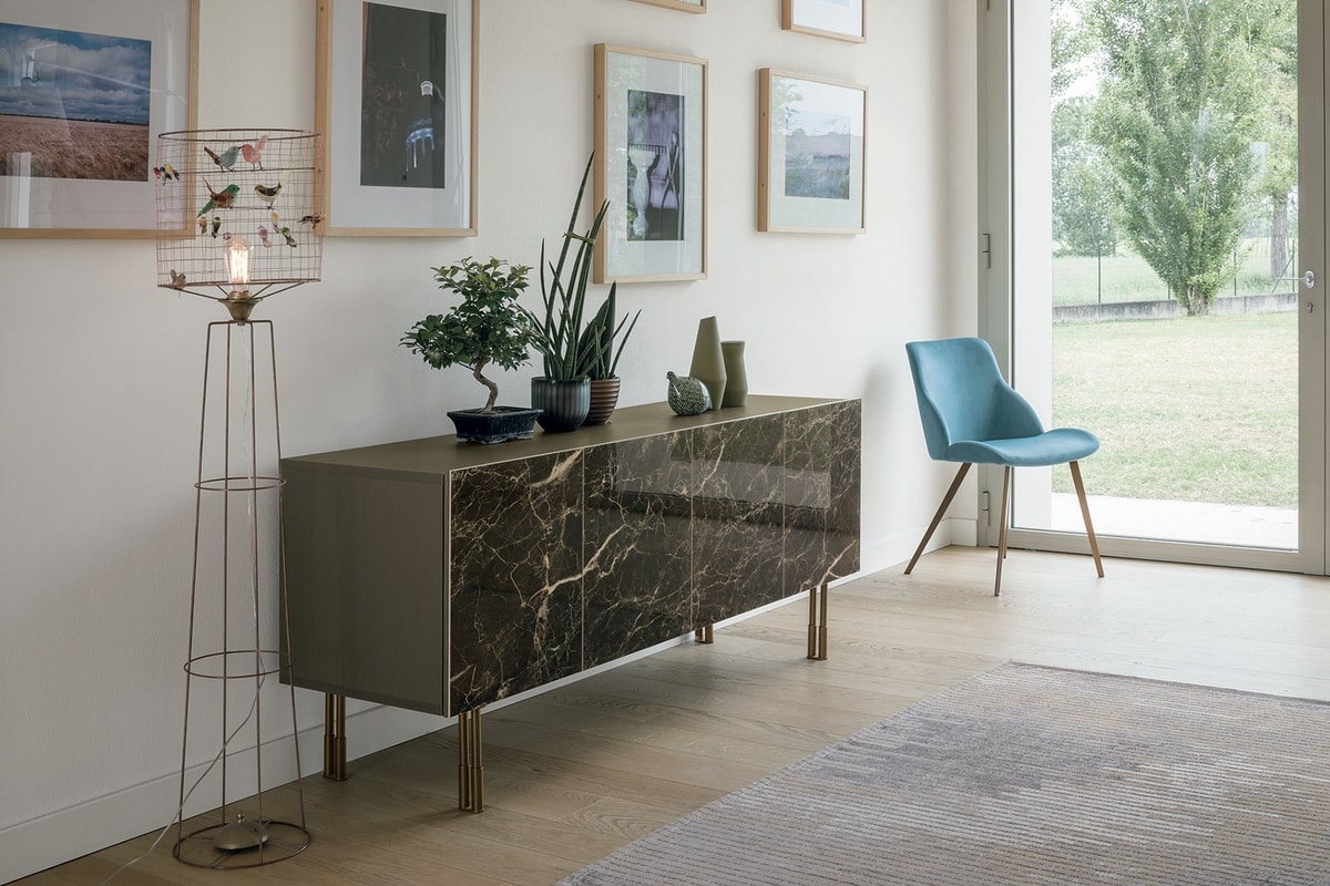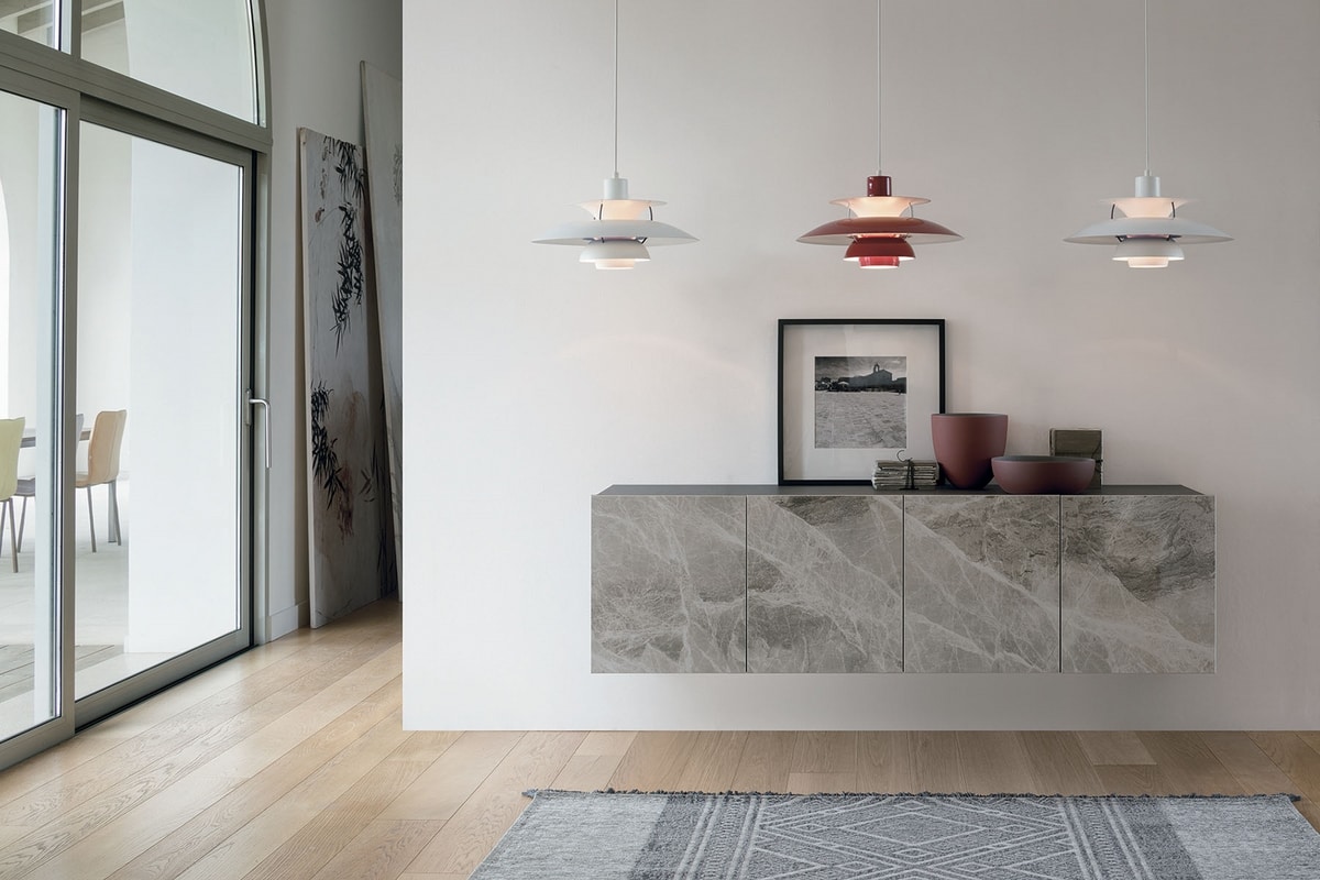 Ein szenografisches Sideboard, das jeden Raum charakterisieren kann und auch als wandhängende Version erhältlich ist. Die Türen aus Feinsteinzeug mit Marmoreffekt oder gewelltem Glas sorgen für Eleganz und Persönlichkeit.