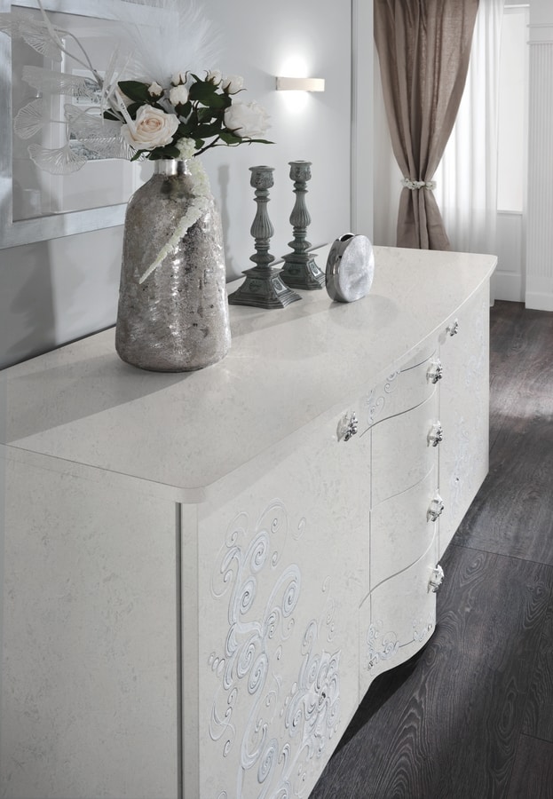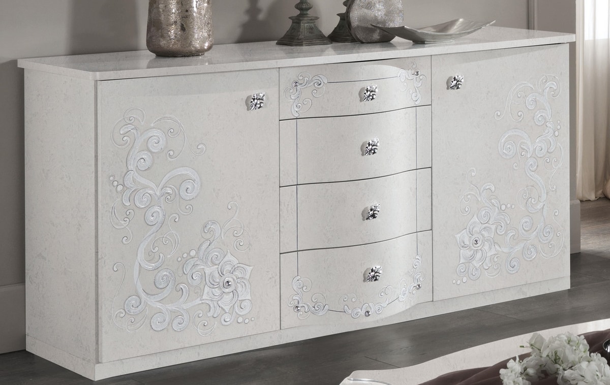 Contromobile matt weiß lackiert, bemalt und von Hand verziert. Mit zwei Seitentüren und zentralen Schubladen. Erhältlich in zwei Versionen, wie auf dem Foto gezeigt, mit Füßen oder mit Sockel.