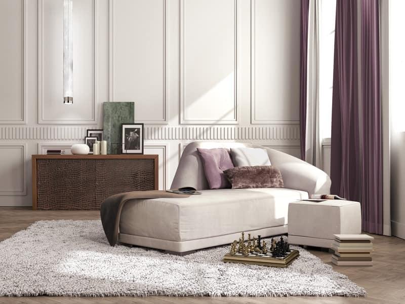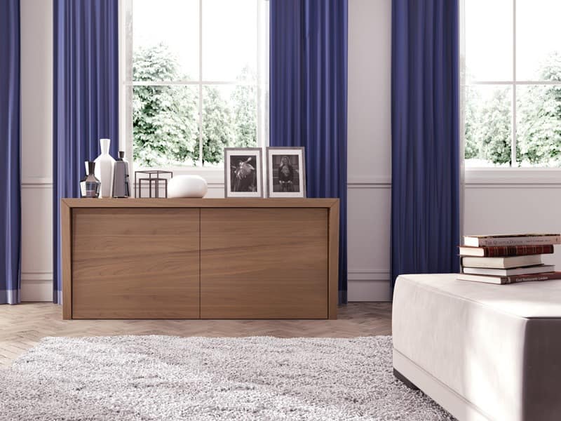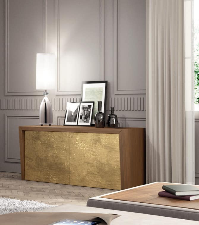 Elegant und hoch raffinierten Sideboard in Nussbaum Canaletto mit trapezförmigen Seiten. Sideboard mit Türfront in Stoff, Leder oder Gold-Silber-Blatt Abgang.