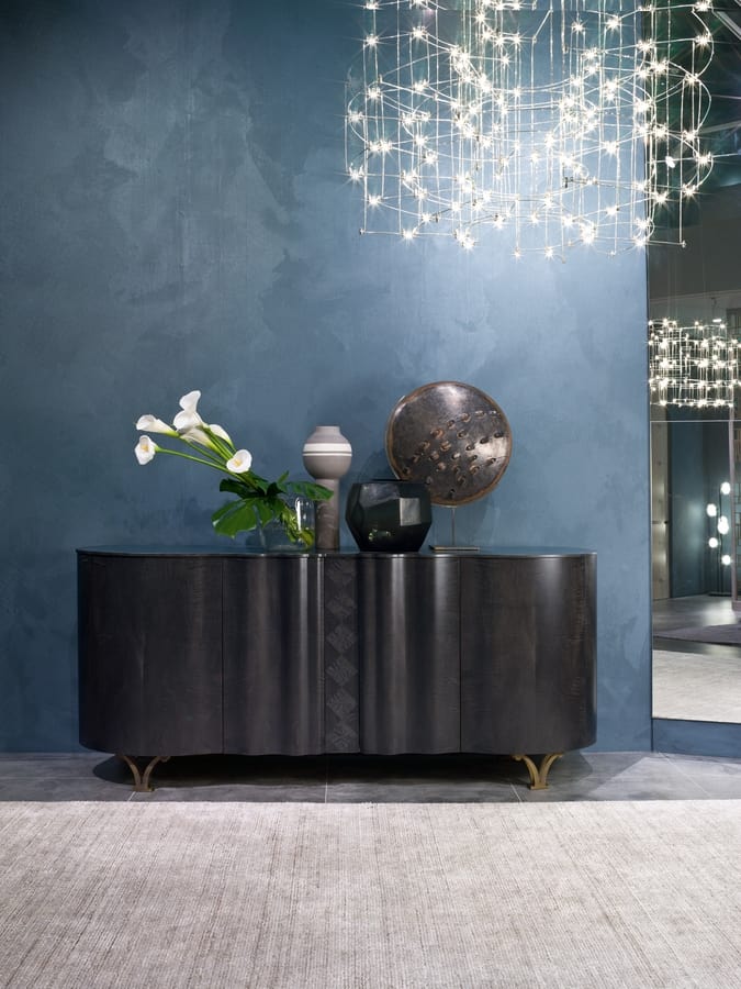 Sideboard aus dunklem Sycomoro Friséholz, verziert mit der Weichheit der Linien, geometrischer Einlage in der Mitte und Metallfüßen mit bronzefarbener gebürsteter Oberfläche.