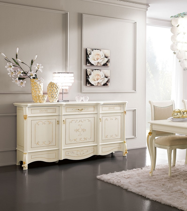 Sideboard aus Holz, mit 3 Türen und Zentralschrank. Handgefertigt dekoriert. Eine besondere Harmonie zwischen Formen und Elementen, Räumen und Körpern, subtile Dekoration unterstreicht die Aufmerksamkeit für jedes Detail.
