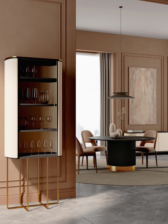 Es besteht aus lackiertem Holz und einer glänzenden Messingoberfläche und ist in zwei verschiedenen Konfigurationen erhältlich: zum Ausstellen (mit einer Glastür) oder zum Verbergen (mit einer lackierten Tür), um Ihre Objekte zur Schau zu stellen oder sie vor neugierigen Blicken zu verbergen.