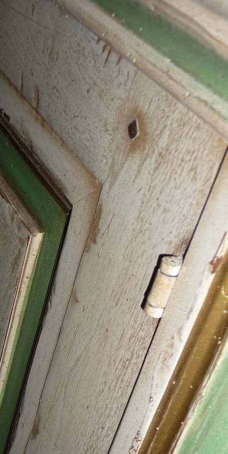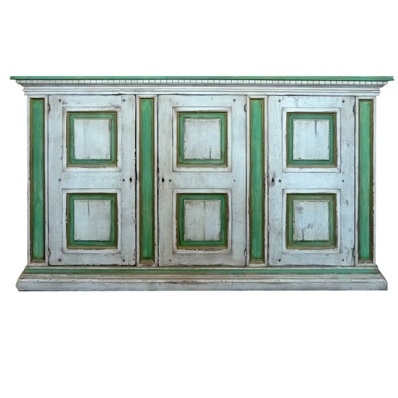 Nach Info fragen Ähnliche Outlet ProdukteNussbaum-Sideboard im Renaissancestil, inspiriert vom toskanischen Stil des 16. Jahrhunderts, mit Prägungen mit spanischem Einfluss, die sich aus der Ankunft von Charles V. in Italien ergeben. Geformter Architrav mit gekerbter Schnitzerei. Glatte Pilasterstreifen mit Gesims wechseln sich ab mit drei tief geprägten Rahmentüren mit Blumeneinlage in der Mitte und schlanken Kanten mit einem geometrischen Ahornmuster auf den Gesimsen, das auch an den Seiten angebracht ist. Das Innere aus Eschen- und Kalkholz enthält fünf Regale und zwei Schubladen. Geformter Boden am Boden, typisch für den Einrichtungsstil der damaligen Zeit. Auf dem Foto weiß getönte und lackierte Struktur (Code: Bianco) mit grün lackierten Kanten und goldlackiertem Gesims mit starker Bedrängnis.