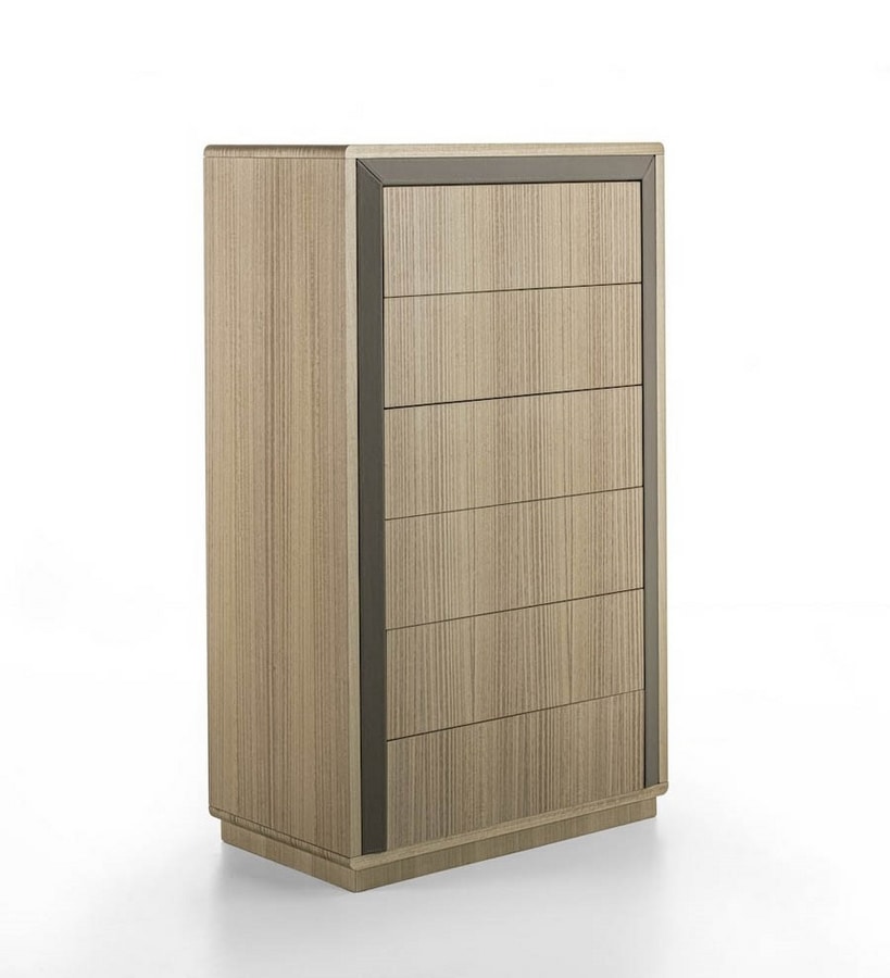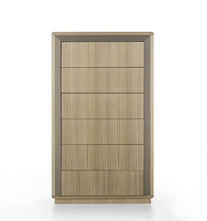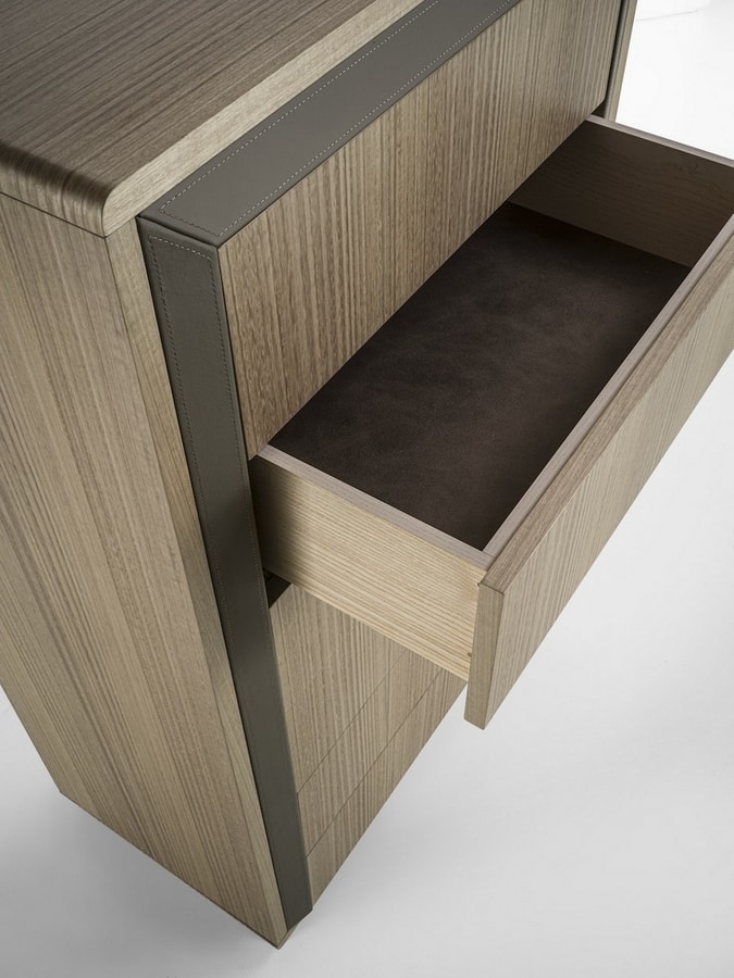 Schrank mit Schubladen, bereichert durch die Kombination edler Materialien wie Eukalyptusseil F129 und Leder. Die Schubladen sind mit einem Rallenty- und Push-and-Pull-System ausgestattet.