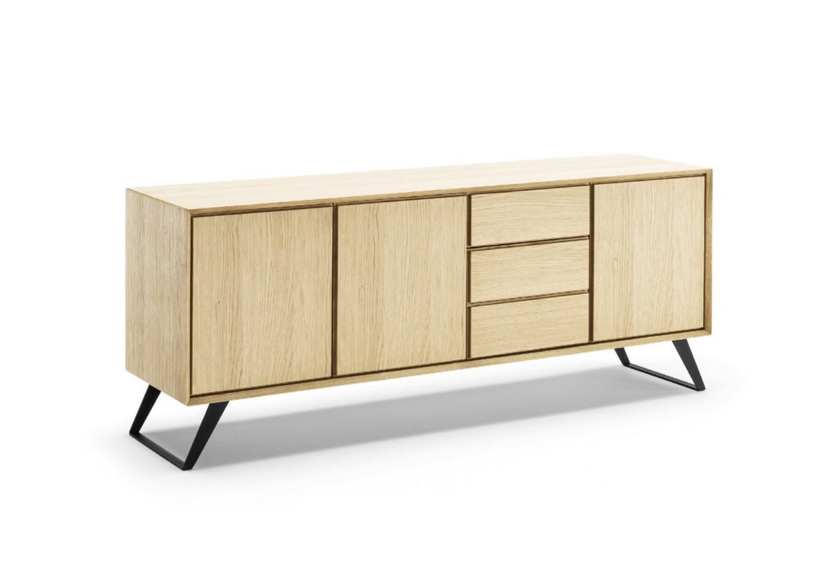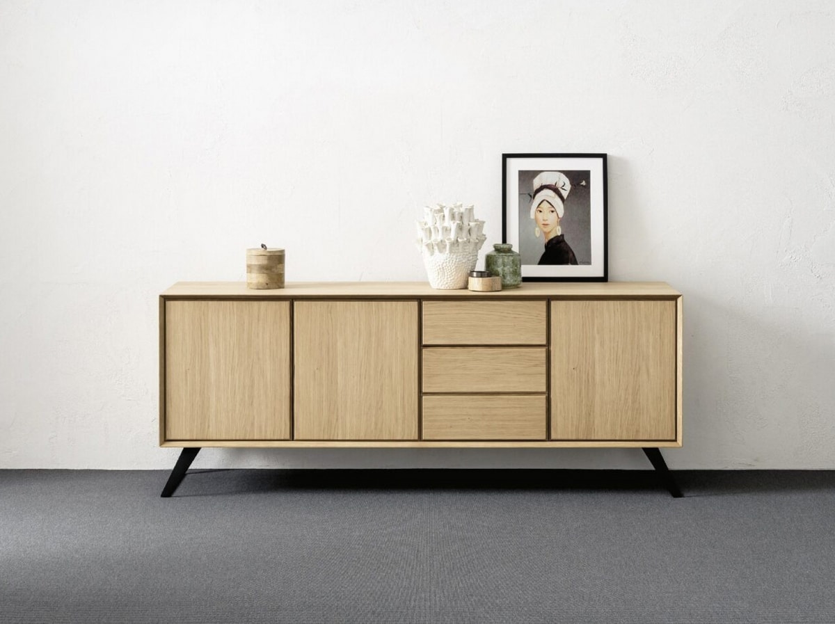 Sideboard vollständig aus Eichenholz oder Nussbaum mit gebürsteter Außenseite realisiert. Die eingesetzten Vinylkleber und Harnstoffharzleime auf Wasserbasis entsprechen den UNI-CEE (EWG) Richtlinien. Untergestell aus massivem Eichenholz, aus pulverbeschichtetem Stahl oder oxidiert mit Acrylausführung.