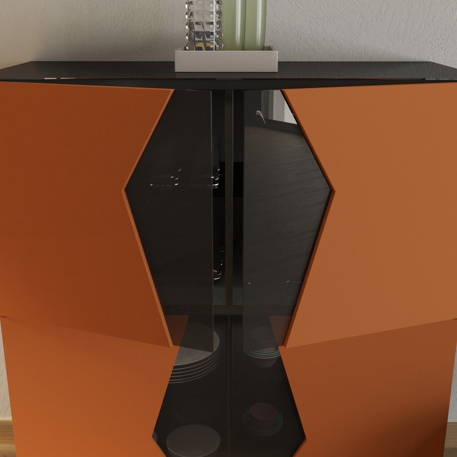 4-türiger Schrank. Mattorange lackierte Seiten und Türen. Geformte Türen mit Rauchglas. Schlanker Sockel aus anthrazitfarben lackiertem Metall. Oberseite aus geräuchertem Spiegel.