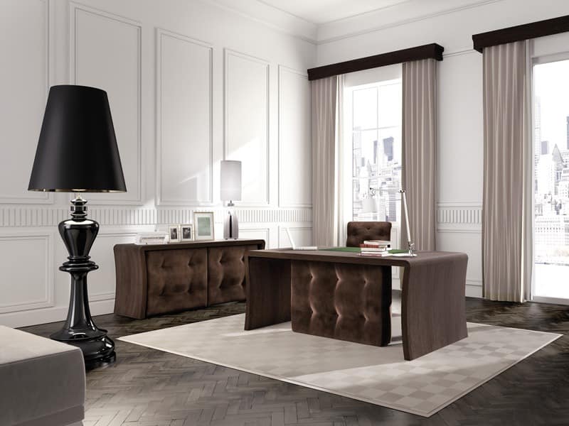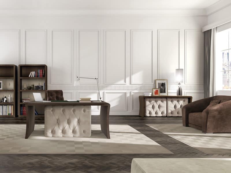 Elegant und hoch raffinierten Schrank mit Holzverkleidung in Eiche Rauch, abgerundeten Seiten und Fronten mit capitonné in Stoff oder lealther.