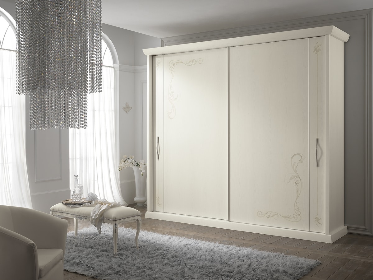 Dior Kleiderschrank mit 2 Schiebetüren, Esche weiß, handdekoriert.