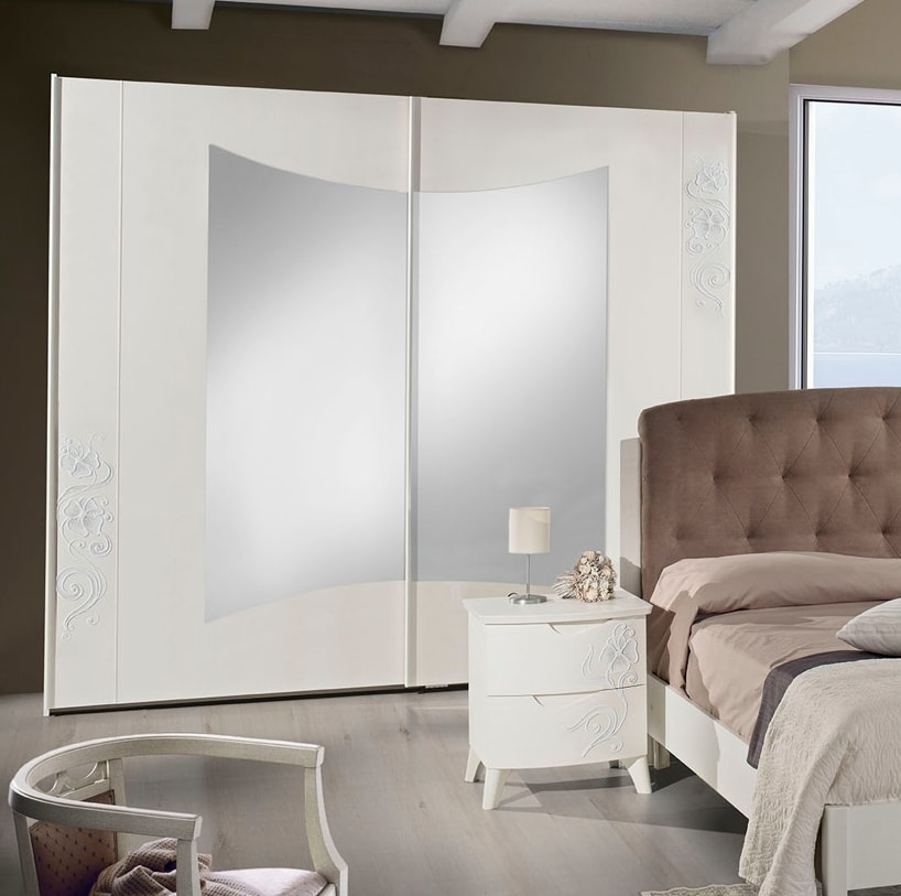 Emily Kleiderschrank 2 Schiebetüren, Esche weiß, handdekoriert, mit Spiegeln. Sanft schließende Türen.