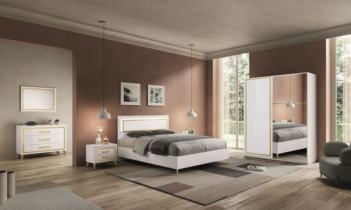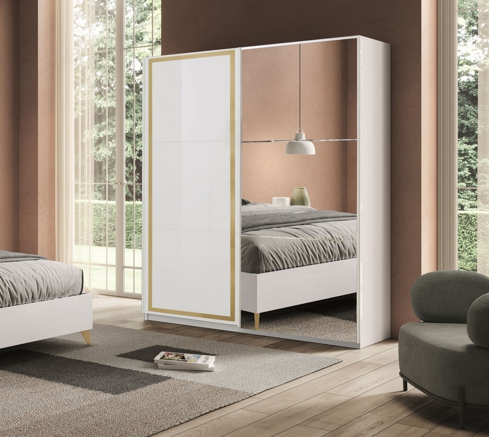 Moderner Kleiderschrank mit zwei Schiebetüren mit weiß lackierter Holzstruktur. Verzierung mit Goldfinish. Ausgestattet mit Spiegel.