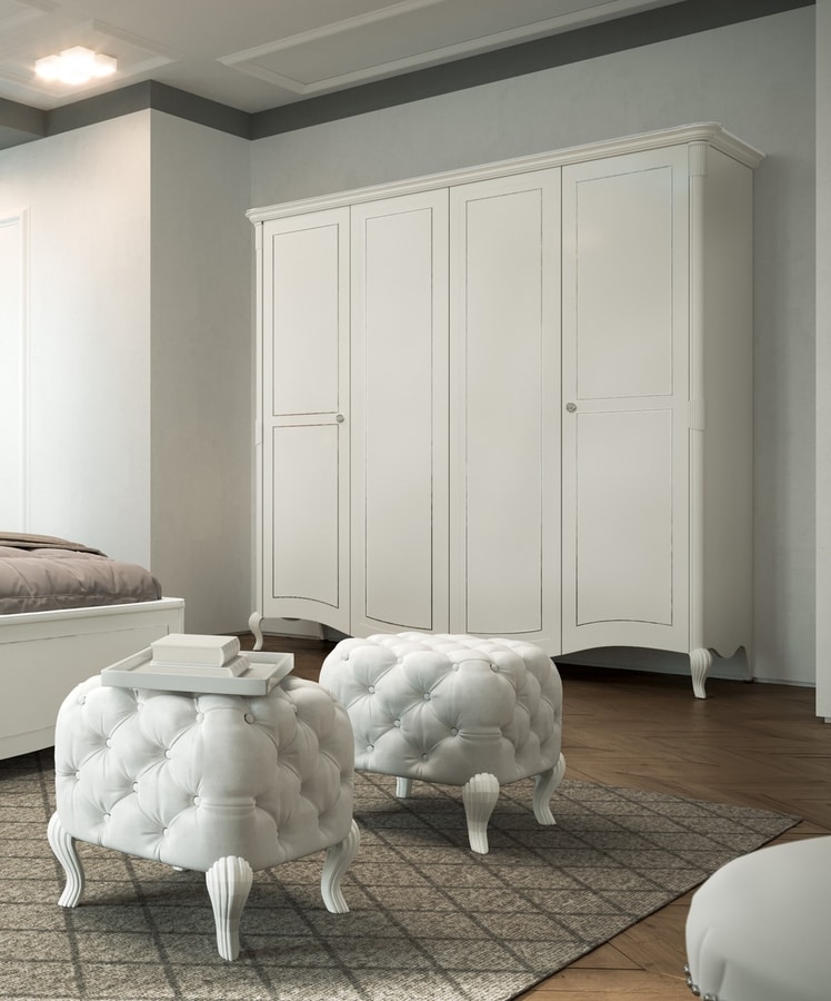 Kleiderschrank mit 4 Türen, aus weiß lackiertem Holz mit Handwerkskunst. Details in Blattgold oder Silber. Inklusive 3 Innenböden und 3 Kleiderbügelrohren.