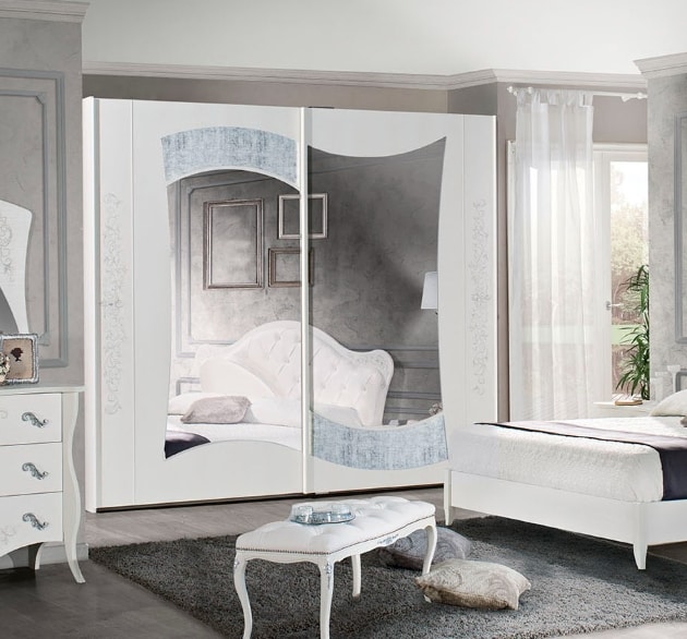 Tiffany-Modell Kleiderschrank mit 2 Schiebetüren, weiße Esche, handdekoriert, mit Spiegeln umgeben von antikem grauem Glas. Sanft schließende Türen.