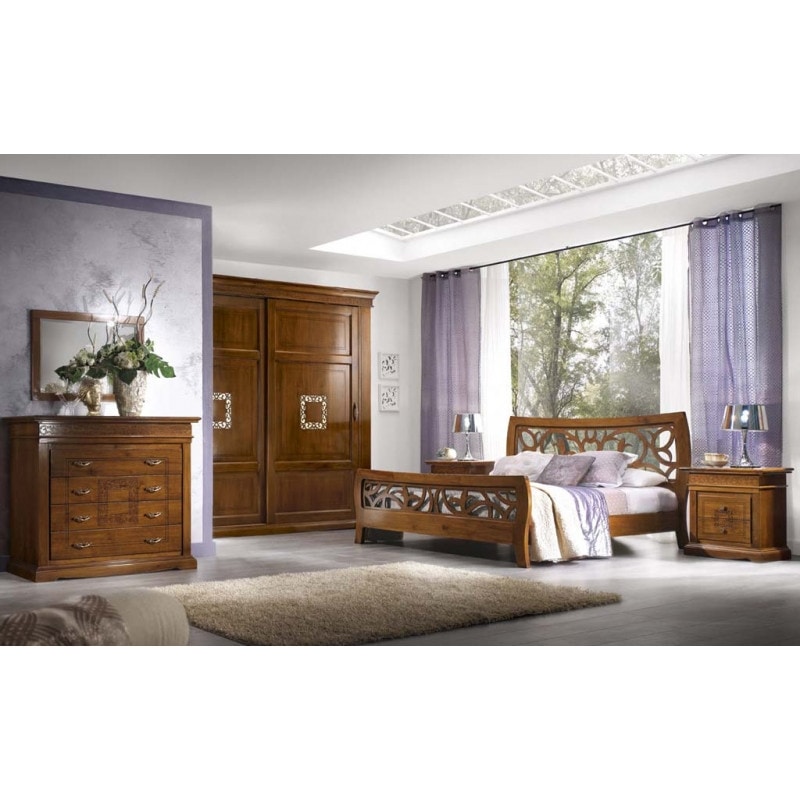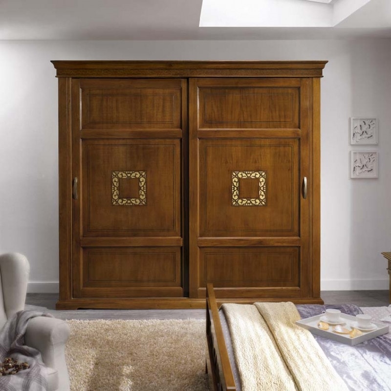 Preise anfordern Ähnliche ProdukteKlassischer Kleiderschrank mit zwei Schiebetüren auf Schienen. Türen aus Massivholzprofilen, zusammengesetzt aus drei Paneelen, hervorstehende Griffe. In den zentralen Quadraten befinden sich goldfarbene Lochplatten. Rahmen der Platte und des Sockels ragen aus dem Möbelkorpus heraus, glatte Seiten. Der Innenraum ist in zwei Fächer unterteilt und mit verstellbaren Einlegeböden ausgestattet. Die serienmäßig mitgelieferte Kommode im Kleiderschrank kann in jedem der beiden Fächer positioniert werden. Die Qualität der verwendeten Materialien garantiert seine Stabilität und Langlebigkeit im Laufe der Zeit.