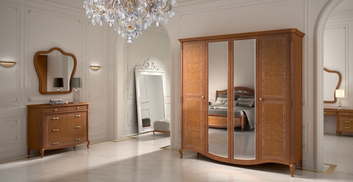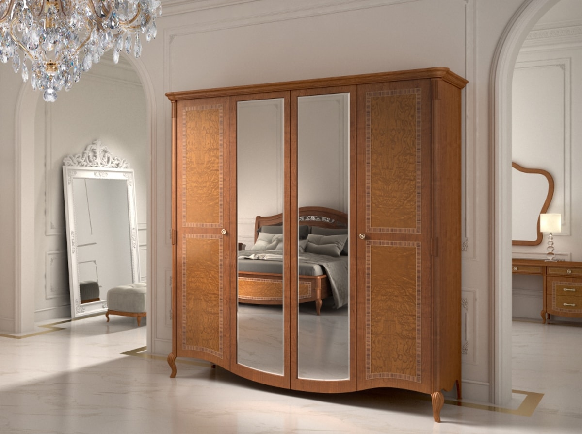 Kleiderschrank mit 4 Türen, Holz mit 2 zentralen Außenspiegeln.