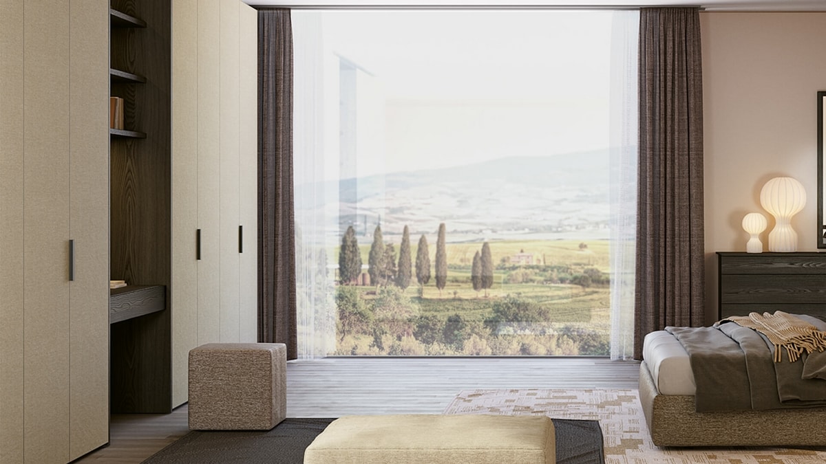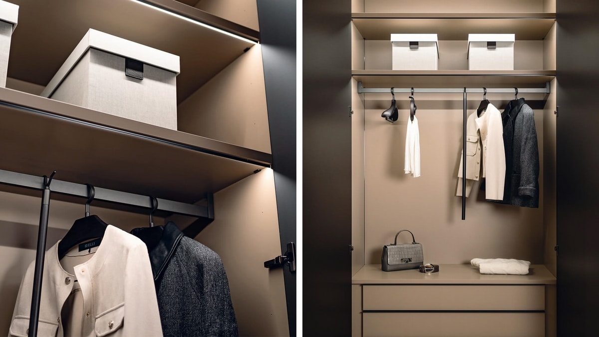 Das Elli-Garderobensystem entwickelt sich ständig mit neuen ästhetischen und funktionalen Lösungen weiter und bietet maximale Gestaltungsfreiheit. Seine modulare Struktur ermöglicht individuelle Konfigurationen und passt sich nahtlos an jeden architektonischen Raum an. Rahmenseitenwände, einschließlich Glasoptionen, Rückwände, Sockel und Regale, werden mit verschiedenen Arten von Türen – Scharnier- oder Schiebetüren – kombiniert, während die Oberflächen von Holzfurnieren über strukturierte Oberflächen bis hin zu edlen Materialien wie Glas reichen und Kleiderschränke in elegante Vitrinen verwandeln. Schubladen, Innenausstattung und Zubehör runden ein anspruchsvolles Angebot ab, das Funktionalität und Design in jedem Raum in Einklang bringt.