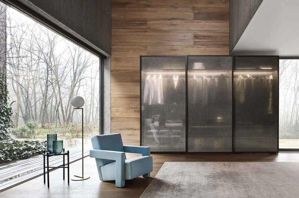 Die Scrigno-Schiebetür mit Rahmen aus braunem Metall und geräuchertem Klarglas verwandelt den Kleiderschrank auch dank des internen Beleuchtungssystems in ein faszinierendes Display. Pullover, Schubladen und ausziehbare Tabletts in Elm Dark-Ausführung mit Frontplatten aus Glas zeigen die wertvollsten Accessoires und Gegenstände.