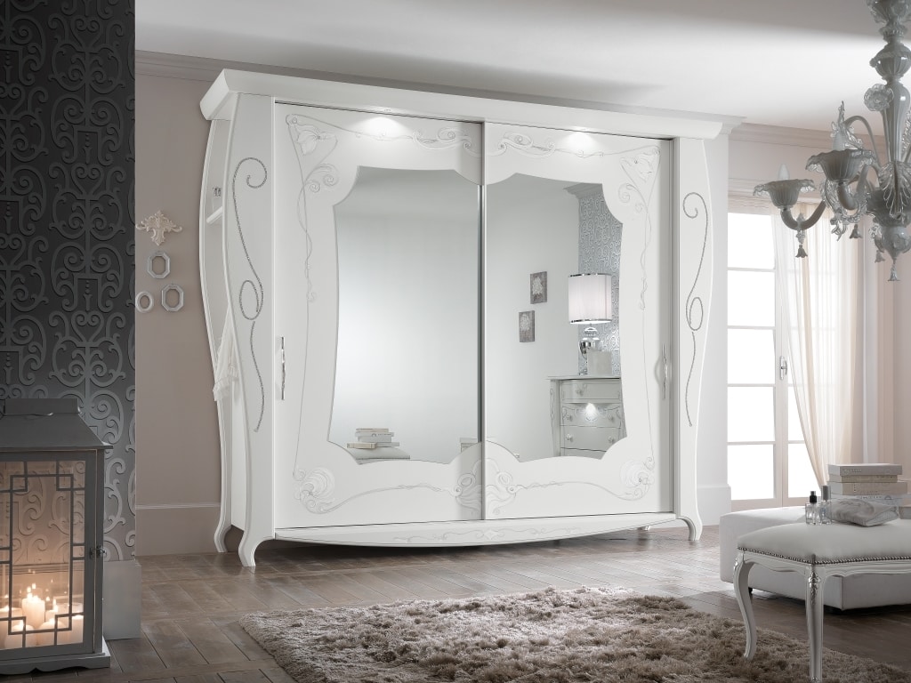 Chloè Kleiderschrank mit 2 Schiebetüren, mattweiß lackiert, handdekoriert. Swarovski-Kette an den Säulen. LED-Leuchten am Hut. Spiegel auf der Vorderseite.