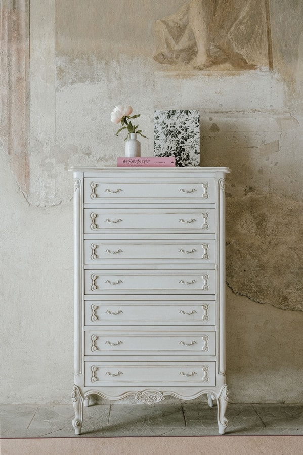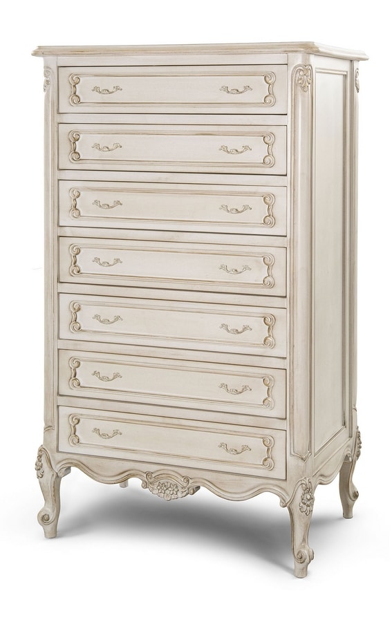 Kommode mit 7 Schubladen mit linearen und wesentlichen Formen mit Finish LAFM, lackiert, gebürstet, französisches Temperaweiß, Baiser mit Blattgoldbasis.