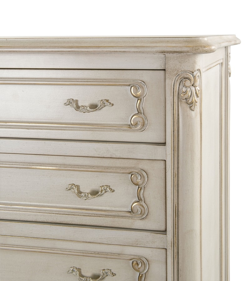 Kommode mit 7 Schubladen, Finish LAFM, lackiert, gebürstet, französisches Temperaweiß, Baiser mit Blattgoldbasis.