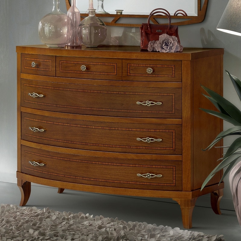 Preise anfordern Ähnliche ProdukteKommode mit vier Schubladen und geformter Front, bereichert durch hochwertige Tischlerarbeiten aus Bois-de-Rose-Fäden auf einem Sockel aus Walnussholz. Die eleganten Griffe werten die Möbel zusätzlich auf. Diese Kommode hat leicht gebogene Säbelbeine, die ihr ein schlankes Aussehen verleihen und eine einfache Reinigung des darunter liegenden Teils des Möbels ermöglichen.