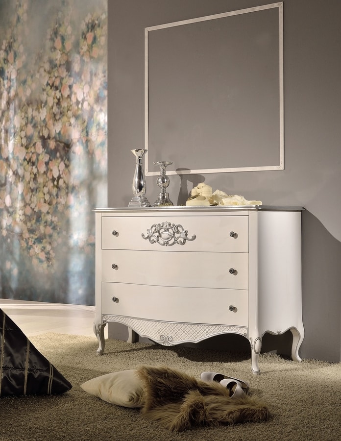 Klassische Style -Truhe von Schubladen, ausgestattet mit 3 Schubladen. Aus Holz, lackiertes Finish. Dekorative Schnitzereien im silbernen Blattfinish.