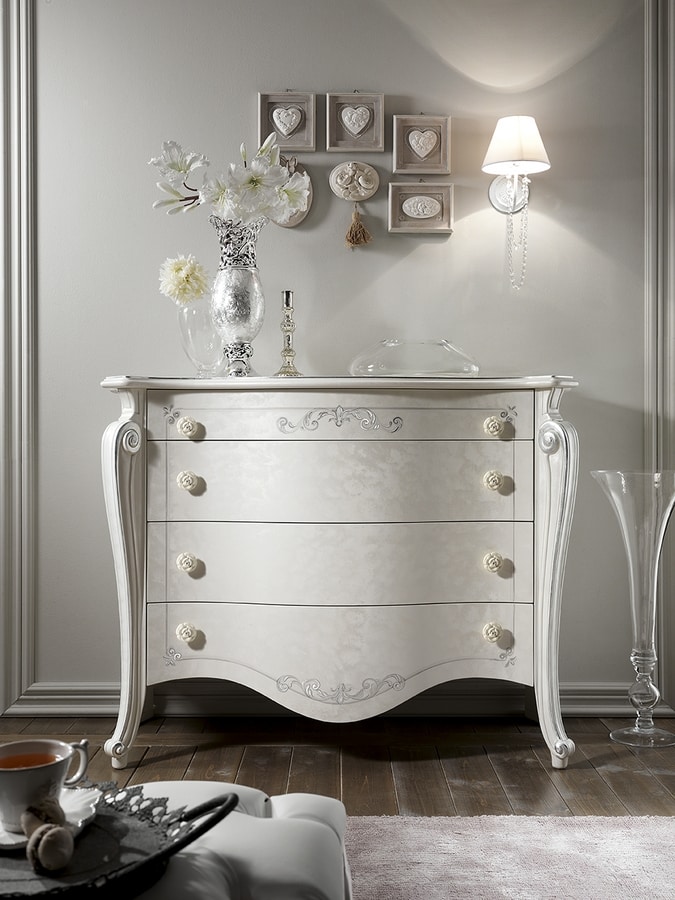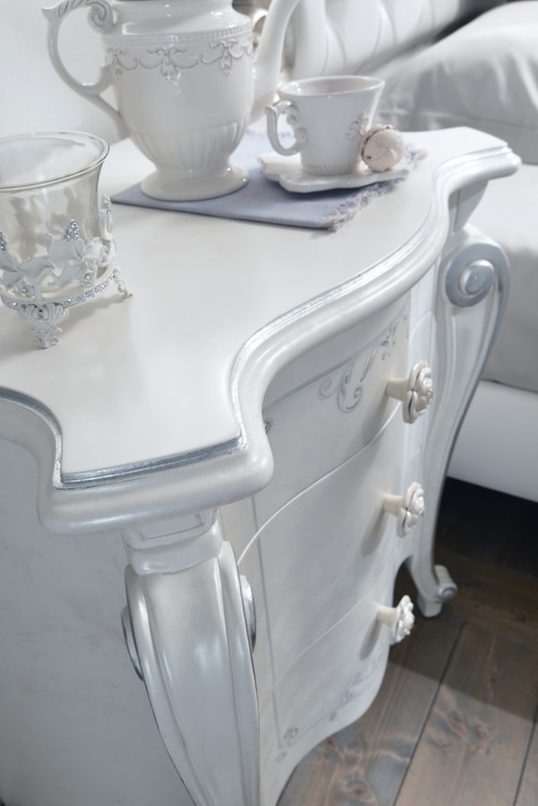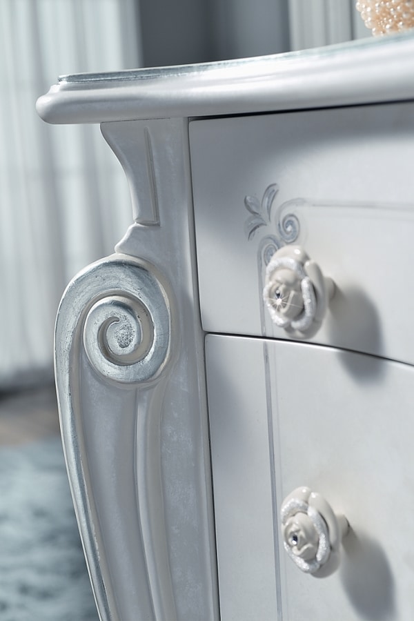 Kommode und 2 Nachttische Chanel Perlmutt weiß, von Hand bemalt und verziert. Mit Blattsilberdetails an den Oberteilen und Beinen. Besonderes Swarovski auf den Dekorationen. Schubladen mit Blumotion-Führungen, sanftes Schließen.