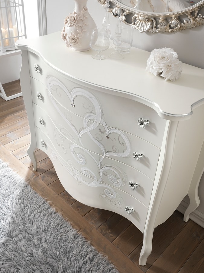 Kommode und 2 Nachttische Cuore in mattweißem Lack, von Hand bemalt und verziert. Mit Blattsilberdetails auf den Oberteilen und Swarovski-Details auf der Dekoration. Schubladen mit sanft schließenden Blumotion-Führungen.