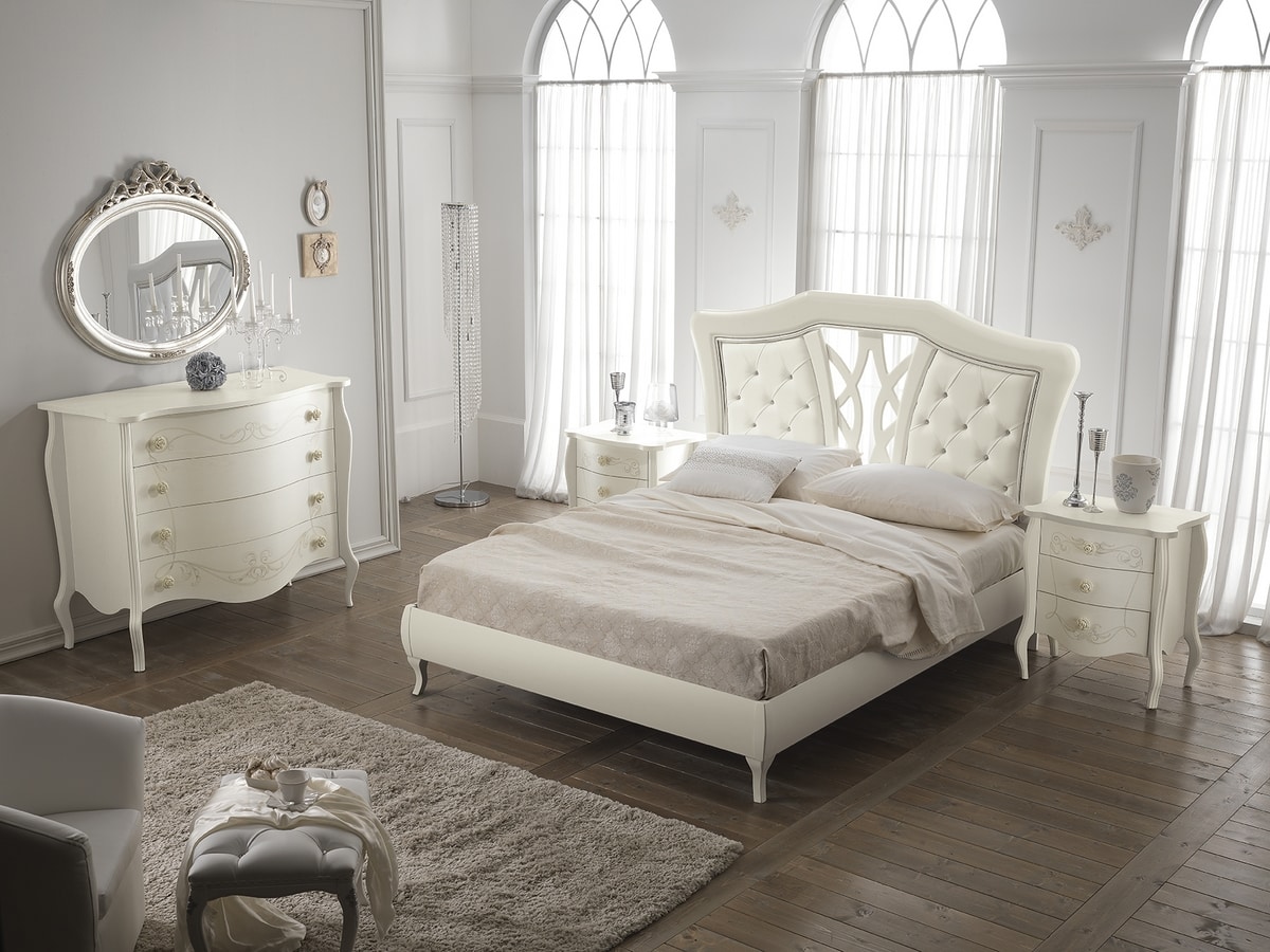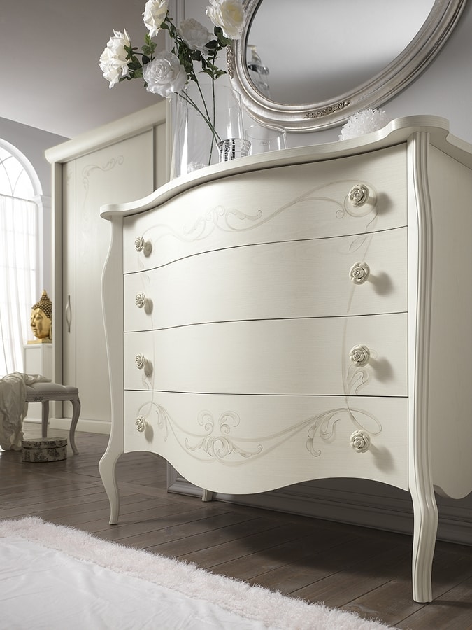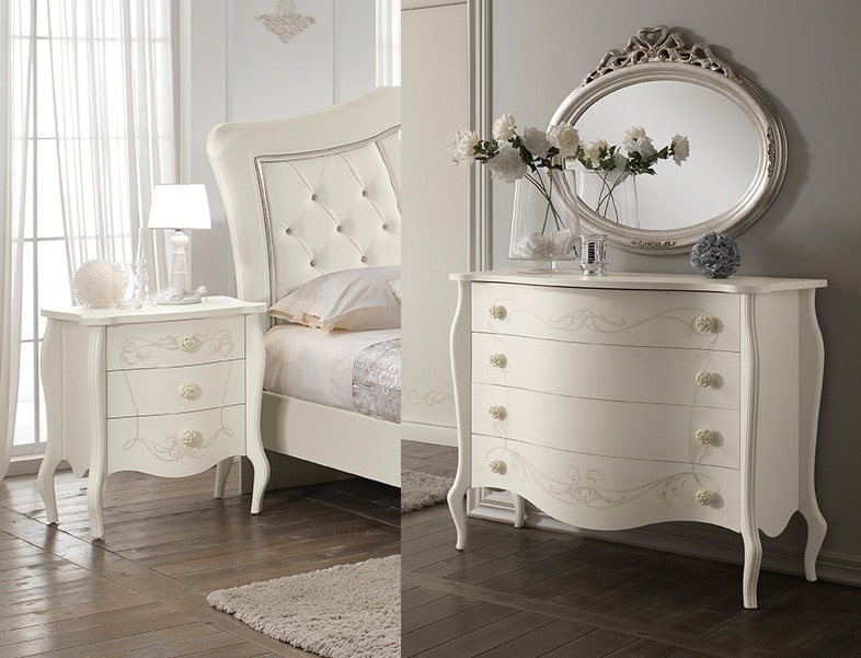 Dior Kommode und 2 Nachttische aus weißer Esche, handdekoriert. Schubladen mit sanft schließenden Blumotion-Führungen.