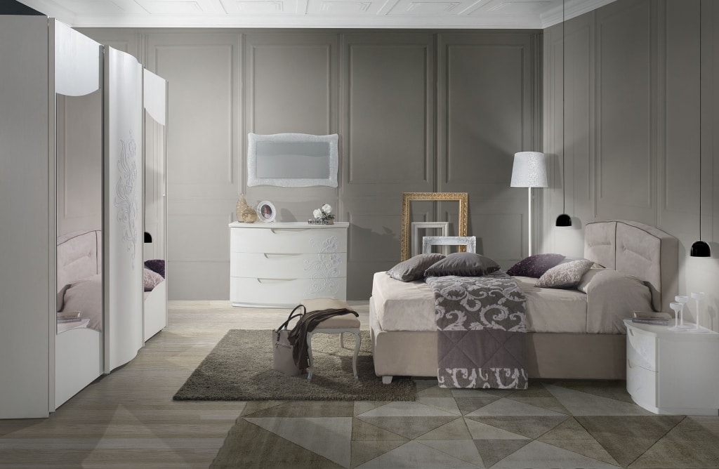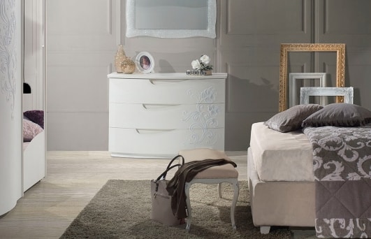 Komplette Triptychon-Kommode und nr. zwei Nachttische Modell Emily, Esche weiß, mit Reliefdekor. Schubladen mit Blumotion-Führungen, sanftes Öffnen.