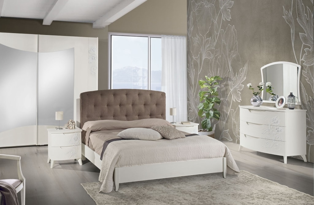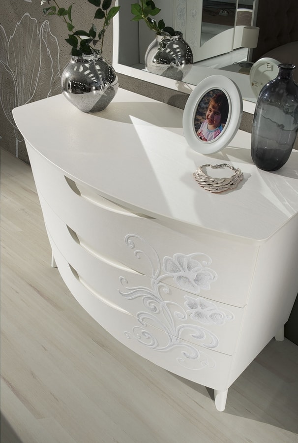 Komplette Triptychon-Kommode und nr. zwei Nachttische Modell Emily, Esche weiß, mit Reliefdekor. Schubladen mit Blumotion-Führungen, sanftes Öffnen.