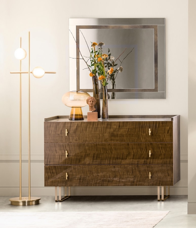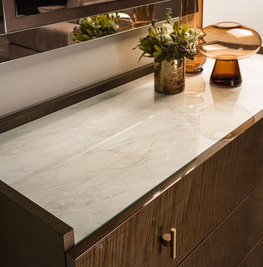 Preise anfordern Ähnliche ProdukteIm Fiamma-Schlafbereich wird die Sprache der Kollektion durch neue Materialvorschläge bereichert, darunter die Platten der Kommode und der Nachttische aus hinterlackiertem Glas mit Calacatta-Gold-Finish.