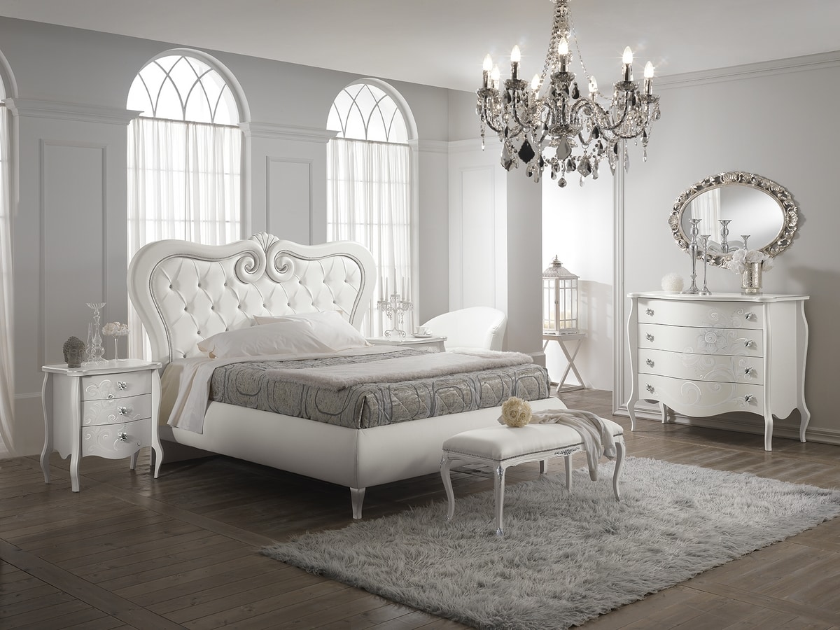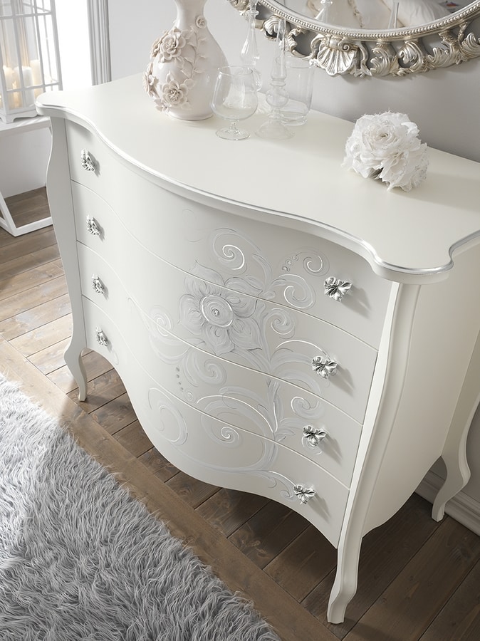 Flora Kommode und 2 Nachttische matt weiß lackiert, von Hand bemalt und verziert. Mit Blattsilberdetails auf den Oberteilen und Swarovski-Details auf der Dekoration. Schubladen mit sanft schließenden Blumotion-Führungen.