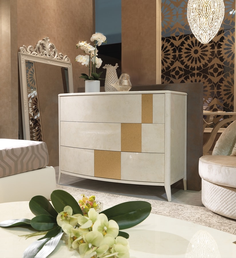 Kommode aus lackiertem Holz in Marmoreffekt mit Silber- oder Golddetails.