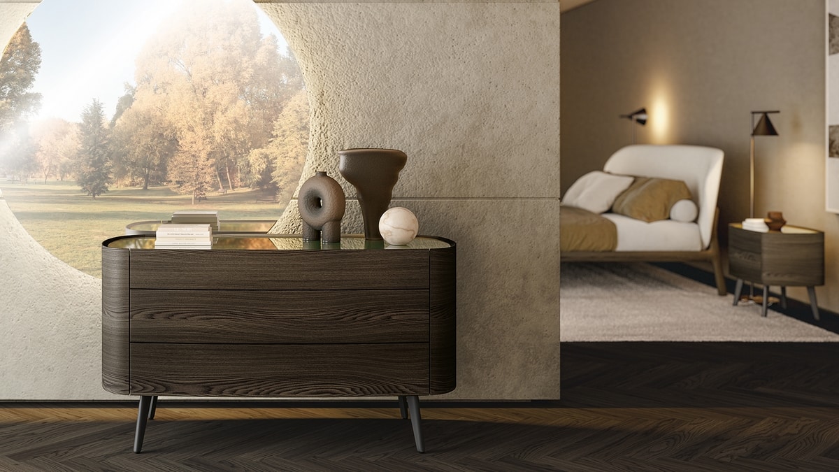 Grace ist eine Familie von Kommoden und Nachttisch mit Linien, die gleichzeitig harmonisch und stark sind. Sie passen perfekt zu Ellis Bettensortiment, das sich stets durch zeitlose Eleganz auszeichnet. Die Struktur und die Schubladenfronten sind aus Holz gefertigt, das sich harmonisch in die Metallhalterung einfügt. Die Tischplatte ist in vielen Materialien erhältlich: von Ton-in-Ton-Holzessenz bis hin zu lackiertem Glas und Marmor.